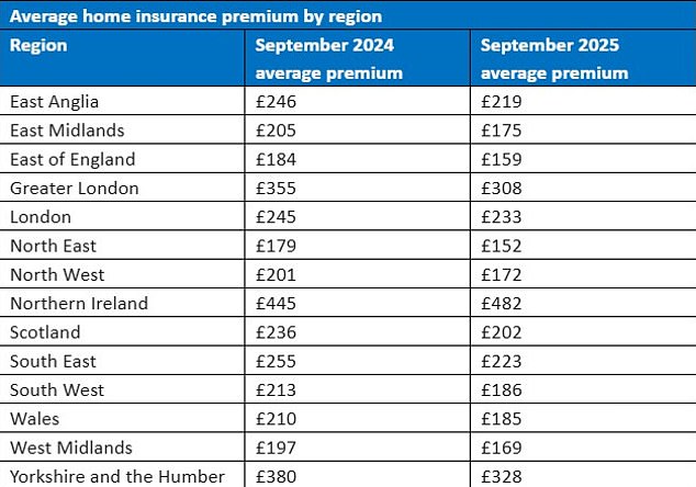 في شمال غرب إنجلترا، دفع أصحاب المنازل عادةً 172 جنيهًا إسترلينيًا للتأمين على المنزل، بانخفاض 14 في المائة من 201 جنيه إسترليني في سبتمبر 2024.