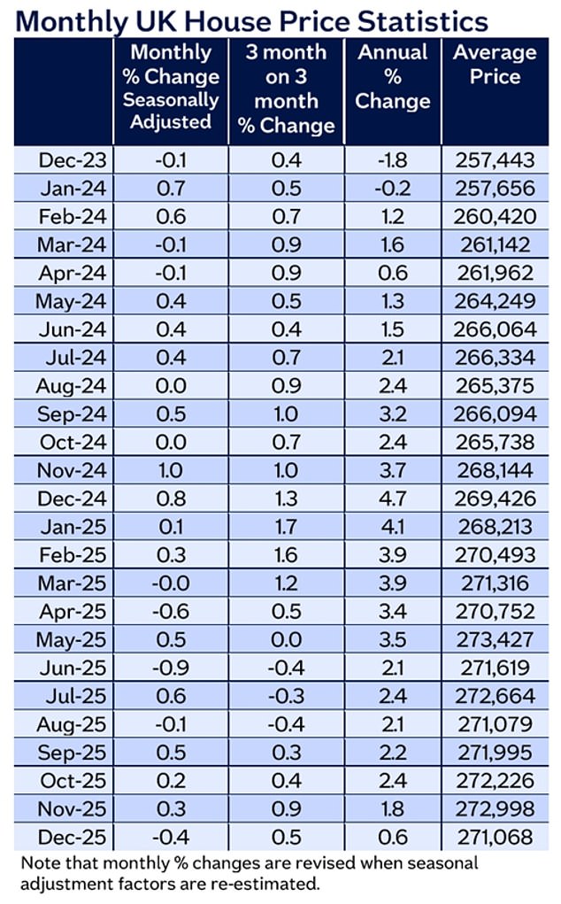 وفي الشهر الأخير من العام، انخفضت الأسعار بنسبة 0.4 في المائة لتصل إلى 271.068 جنيهًا إسترلينيًا في المتوسط.