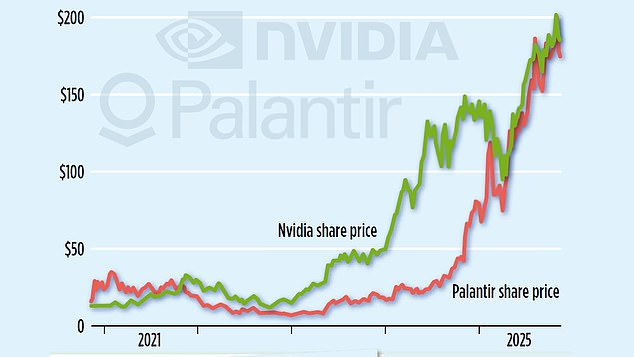 وتوقع أن ينخفض سعر سهم شركة Nvidia، شركة تصنيع شرائح أشباه الموصلات بقيمة 3.6 تريليون جنيه استرليني والتي ارتفعت أسهمها بنسبة 1,352 في المائة على مدى خمس سنوات، وشركة Palantir Technologies، عملاق البرمجيات التي ارتفعت أسهمها بنسبة 1,108 في المائة خلال نفس الفترة.