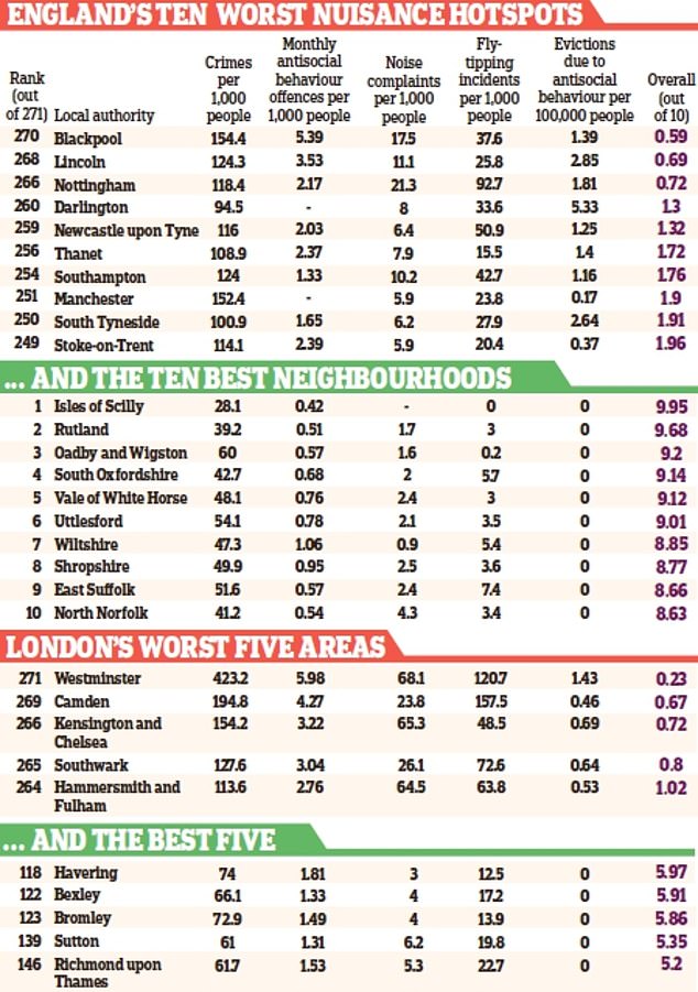 تحقق من طاولتنا لمعرفة ما إذا كانت منطقتك واحدة من أفضل أو أسوأ المناطق بالنسبة للجيران المزعجين – أو انتقل إلى dailymail.co.uk/neighbours للحصول على الخريطة التفاعلية الكاملة لجميع المناطق في إنجلترا.
