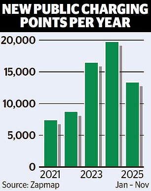 وهذا يضع بريطانيا في طريقها لتركيب عدد أقل من أجهزة الشحن في عام 2025 مقارنة بعام 2024 أو 2023، حسبما تزعم أرقام مجموعة Zapmap الصناعية، مما يثير المخاوف من توقف ثورة السيارات الكهربائية التي استهدفها الوزراء في سعيهم لتحقيق صافي الصفر.
