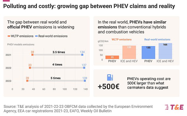 وقالت T&E أيضًا إن سائقي السيارات يتم فرض رسوم زائدة على السيارات الكهربائية الهجينة القابلة للشحن (PHEV) بناءً على وعود كاذبة بشأن أوراق اعتمادهم الخضراء.