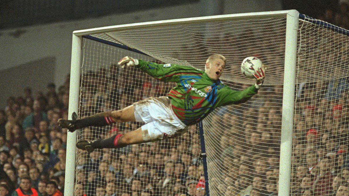 المفضل لدى المعجبين: بيتر شمايكل في مباراة مانشستر يونايتد حيث لعب في فريق السير أليكس فيرجسون الشهير