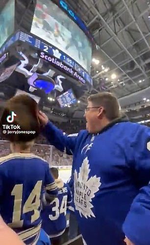 حالة واضحة من النيران الصديقة كادت أن تكلف أحد مشجعي تورونتو مابل ليفز قبعته الثمينة ...