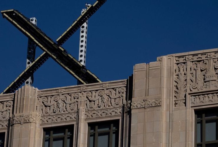 يظهر شعار “X” في الجزء العلوي من المقر الرئيسي لمنصة المراسلة X، المعروفة سابقًا باسم ...