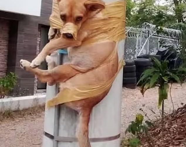 أظهر مقطع فيديو مؤلم كلبًا صغيرًا مقيدًا بلا حول ولا قوة إلى عمود إنارة بشريط لاصق من قبل جار غاضب، ...