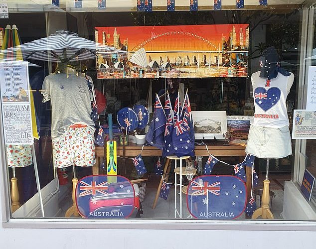 انقسم السكان المحليون حول العرض الفخور لأعلام يوم أستراليا والسترات والقبعات في النافذة الأمامية لمتجر Lifeline. تلقت صورة العرض في ...
