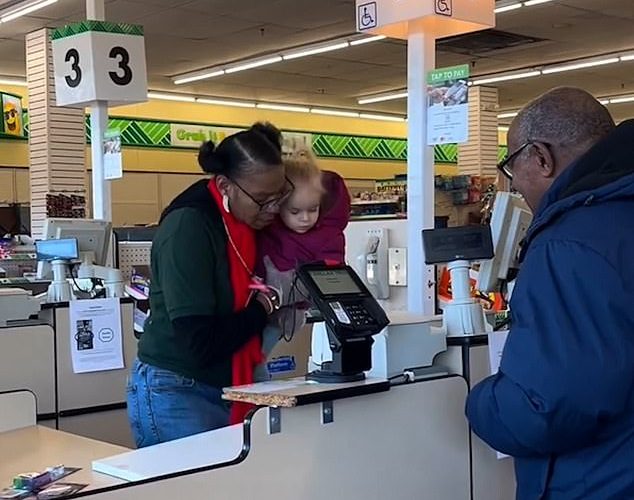هذه هي اللحظة المؤثرة التي يساعد فيها أمين الصندوق الأم من خلال التقاط طفلها الصغير الباكي ومسح العناصر معها. كانت ...